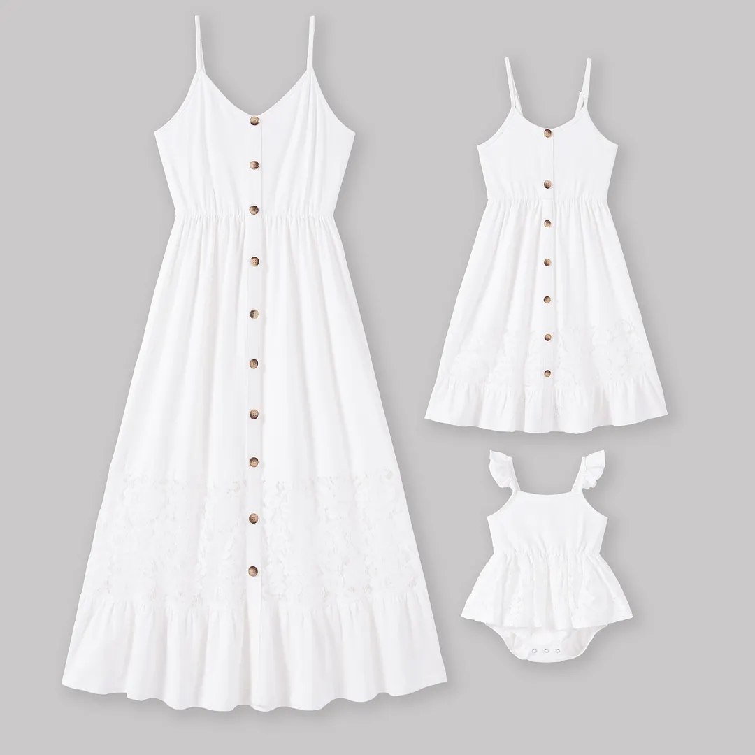 Mommy and Me Button Up White Lace Embellishment Ruffle Hem Strap Dress